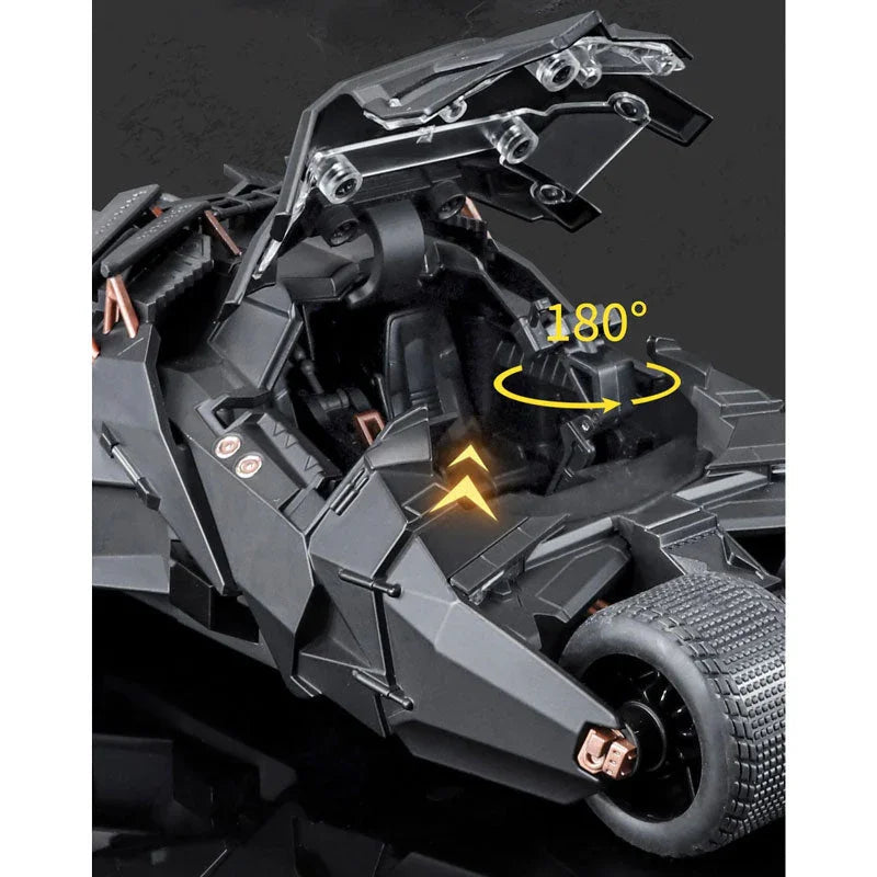 O filme Tumbler original, famoso em Batman Begins e The Dark Knight , traz um design militar-industrial com tração total, estrutura reforçada e aerodinâmica prejudicial. Esta miniatura captura toda a força visual da máquina de combate do Cavaleiro das Trevas — com linhas angulares, pintura preta fosca e detalhes de tirar o fôlego.